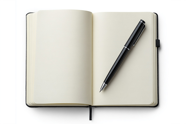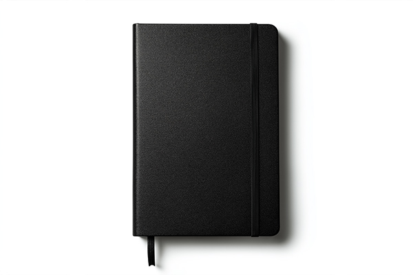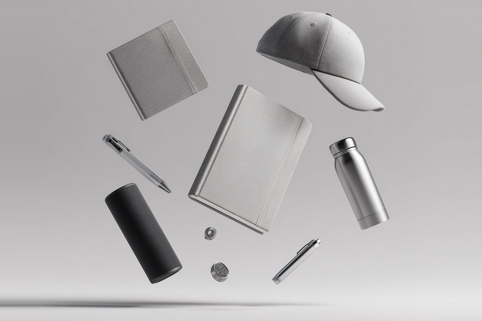 Hardcover, notebooks & pens—sharp typography and color-true materials on bright white.